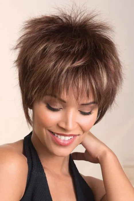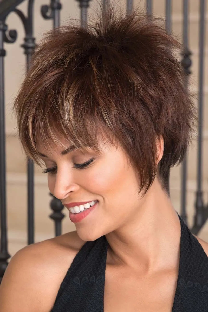 This unique pixie cut is an edgy style that glows with confidence. This razor cut features longer, face framing pieces on the sides and spiky layers for a fearlessly stylish, voluminous look that will make you feel like the rock star you are. This style has a classic cap with inner adjusters so you can get the perfect fit. The low-maintenance synthetic hair holds its style, ensuring that you will always look your best.